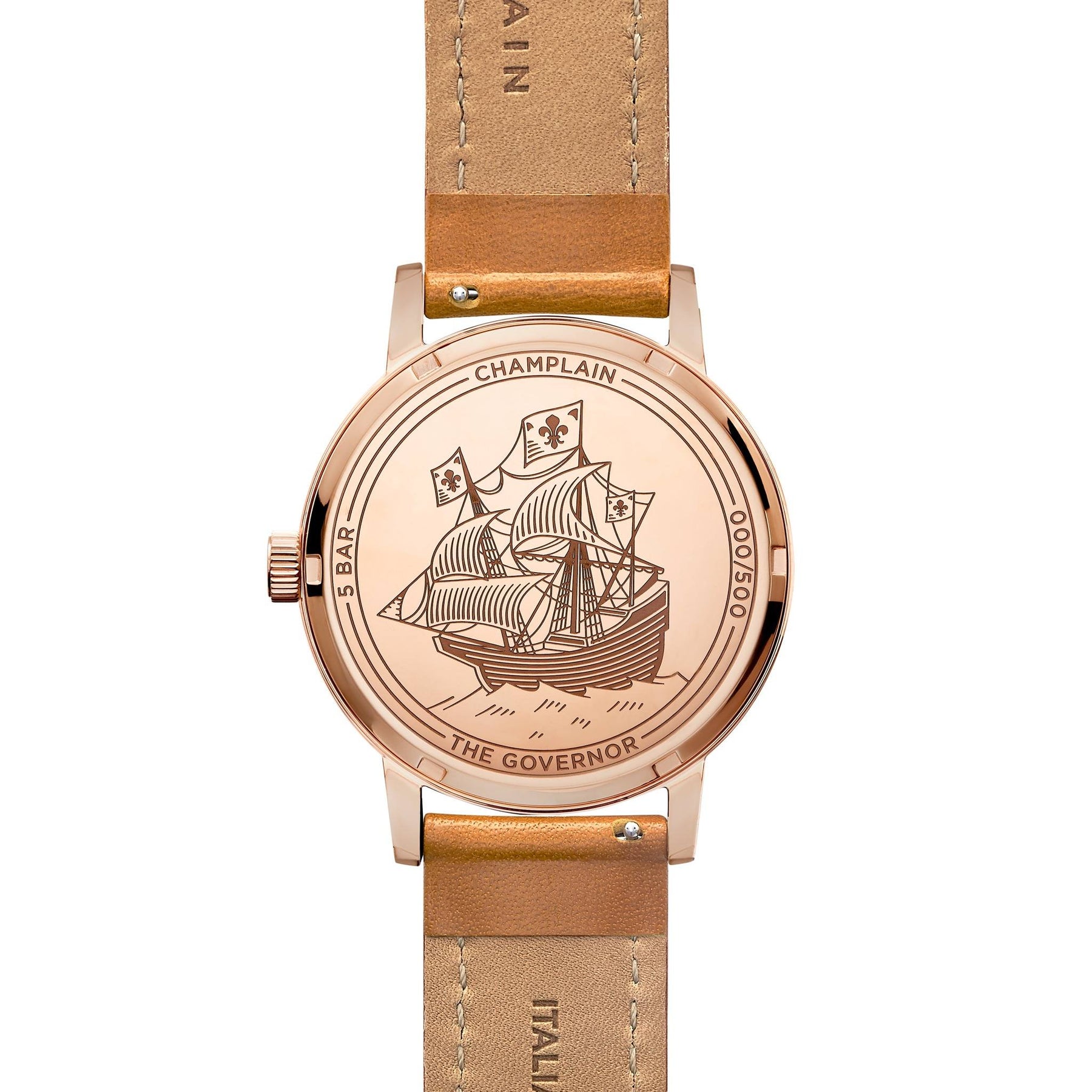 Our first watch, The Governor, is inspired by the Bauhaus design philosophy. It honours the past with the ship of Samuel de Champlain engraved on its case back, while also looking to the future with an elegant design and Swiss quartz movement inside. The vegetable-tanned leather bracelet will look better with age, making this a timeless piece that you'll love for years to come.